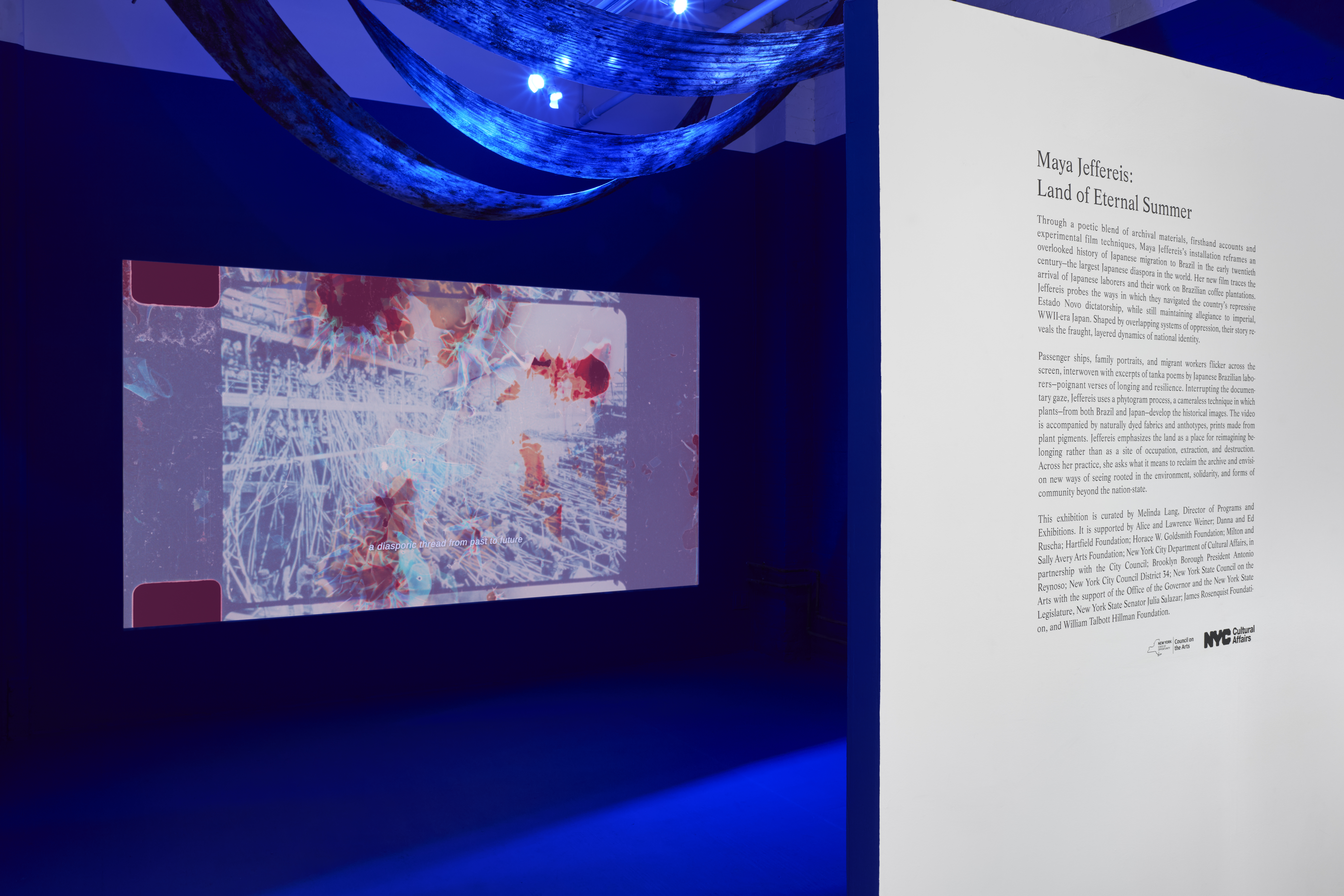 Throughout the video, fragmented images of passenger ships, families, and migrants in fields flicker alongside translated excerpts of tanka poems written by Japanese laborers in Brazil and voiced by their descendants. Beneath these expressions of longing and resilience is an inquiry into the complex dynamics of national identity during Brazil’s Estado Novo dictatorship in the 1930s and ’40s, when Japanese Brazilians endured oppression and cultural erasure while still maintaining ties to imperial Japan. Jeffereis emphasizes the land—not only as a site of occupation, extraction, and destruction, but also as a place for reimagining belonging. Across her practice, Jeffereis asks what it means to reclaim the archive and envision new ways of seeing rooted in the environment, solidarity, and forms of community beyond the nation-state.